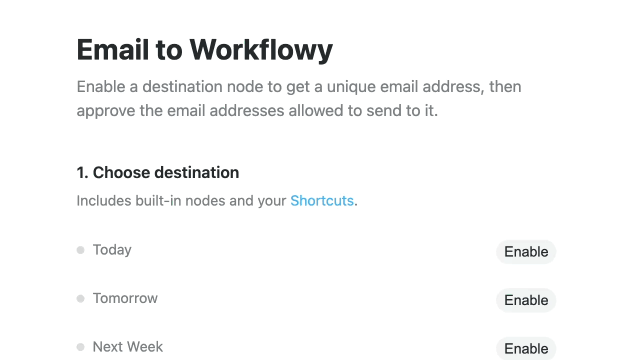 Get a unique email address for key nodes like Today or Inbox, or any node you've added a Shortcut to. You control which email addresses are allowed to send to it.