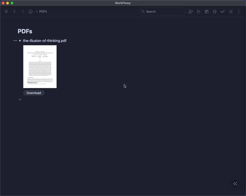 Files and images in Workflowy let you keep everything in one place. Just drag and drop to upload PDFs, screenshots, photos, or any other file right into a bullet.