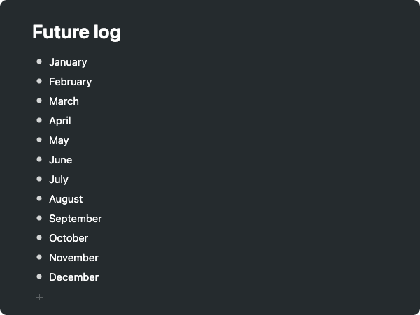 Next we'll add a bullet for each month in the 'Future log'. The original system lists 6 months at a time due to the limitations of space. Since we don't have those limitations we'll go ahead and add the full year.