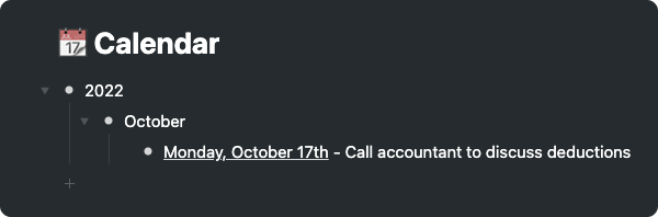 You'll notice in our example of the calendar section, only the item that needed a date tag had one. We didn't have a complete list of all the days for the month. While you can certainly create date tags for each day, it's likely you'll still use another dedicated calendar application to keep track of events. So in this example we opted to keep things as simple as possible.